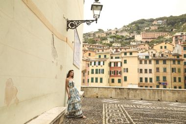 High waist, 3 tiered skirts, fitted hip panel, invisible back zipper & removable belt with gold trim.