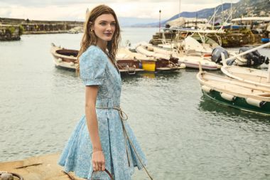 Mini length, plunge neck design, invisible back zipper, pouffe sleeves and removable waist belt.