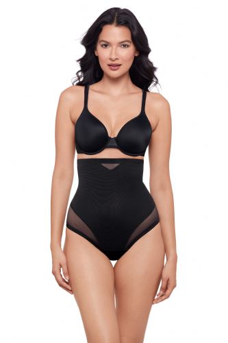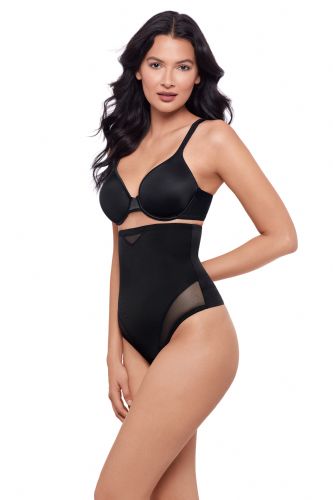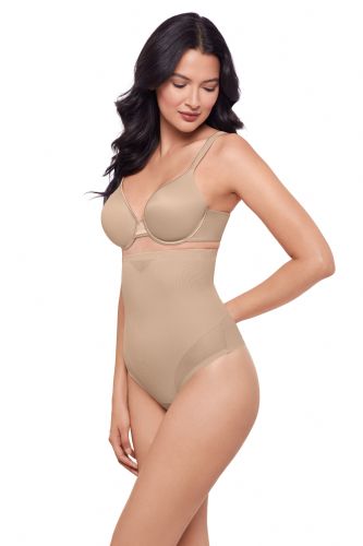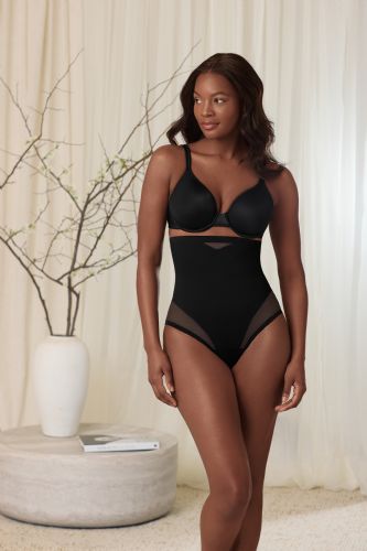 This hi-waist shaper features sexy, sheer panelling that allows the garment to adjust to your body and create a perfect fit. Double panels provide the extra firm control and shaping you want for your mid-section without flattening your backside. This style delivers a smooth look under clothes. Choose this hi-waist thong to transform your midriff, tummy, & waist.