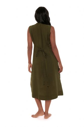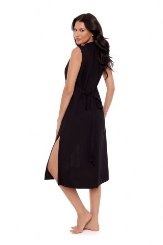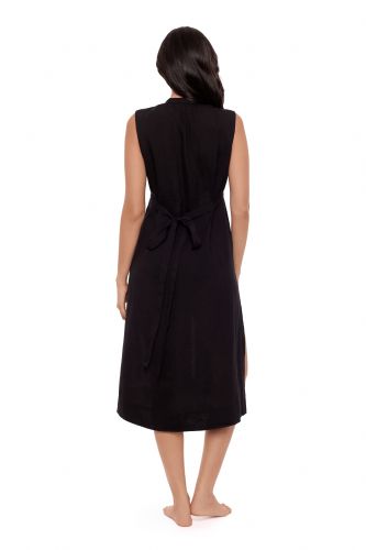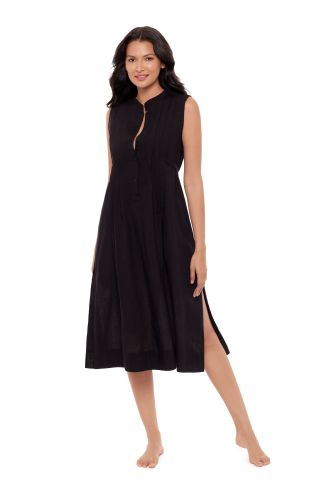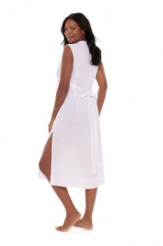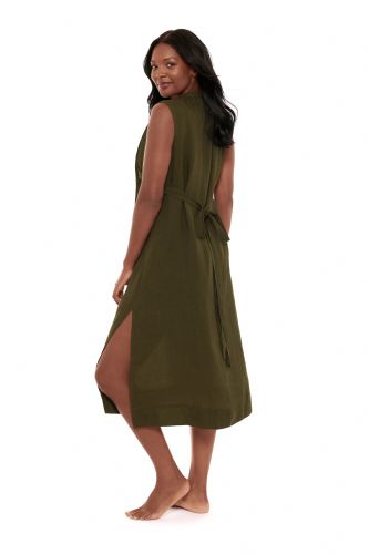 • Notched neckline, button front, fixed adjustable belt, split hem