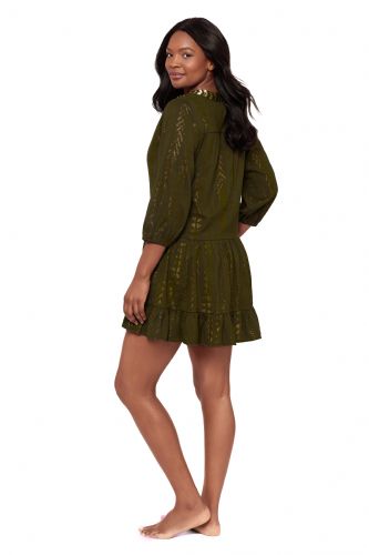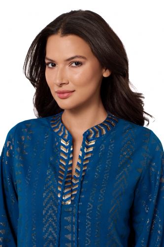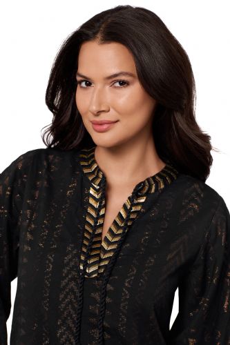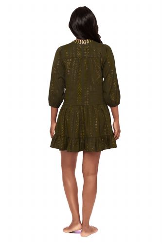 • Tiered, a-line beach dress in cotton voile with embroidered neck and a shimmer gold jacquard